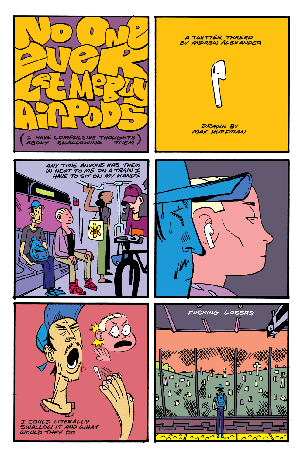 A full-color roundup of short comics from 2021–2022 by Max Huffman. Includes "No One Ever Let Me Buy AirPods", "Kansas City", "Beach Diary" and new "I'm Good" gag strips.
